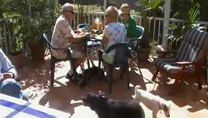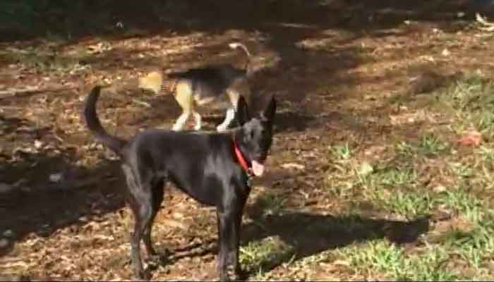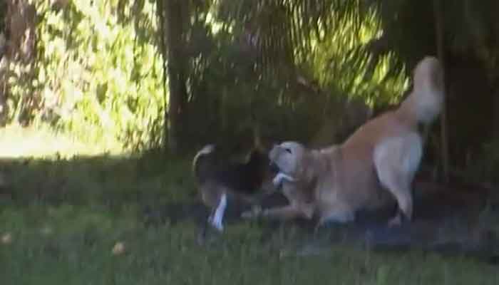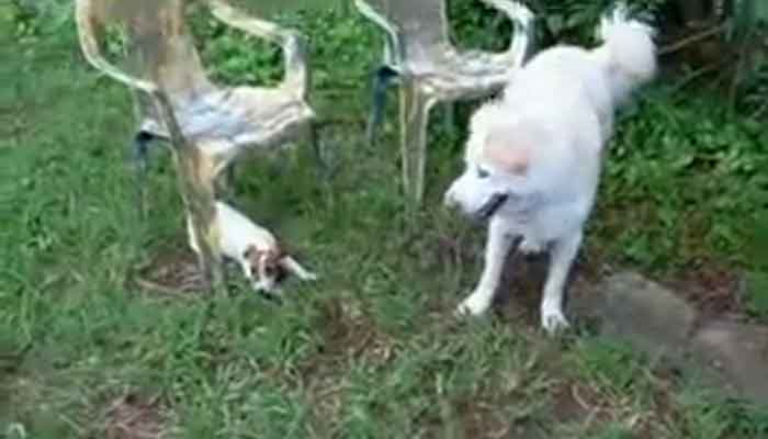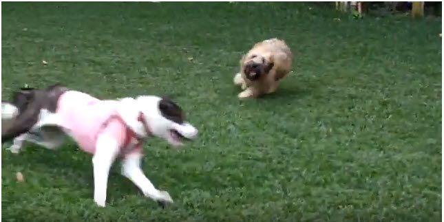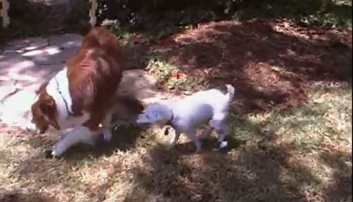 Sparky, the three-legged white Golden playing with little Rajabell./p>